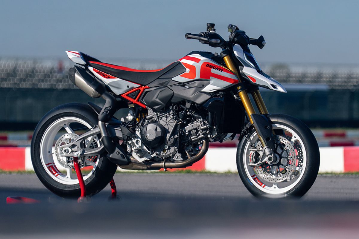 The Ducati Hypermotard V2 is a supermoto powered by an 890 cc V-twin with 120 hp. Its lightweight monocoque frame and upright ergonomics deliver sharp handlingl. The V2 SP adds Öhlins suspension, forged wheels, Brembo brakes, and a lithium-ion battery.