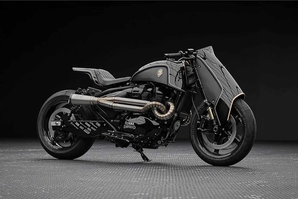 The Royal Enfield Shotgun 650 × Rough Crafts is a limited-edition unusual with only 100 units worldwide. Dressed in gloss and matte black with gold-leaf detailing, brass badges, and a quilted leather seat, it blends factory engineering with custom-bike artistry. Same 648 cc twin, but, says Royal Enfield, its elevated into a dark, collectible icon.