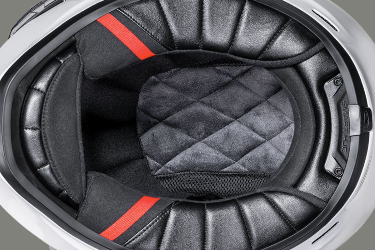 Full front-to-back airflow flushes heat and humidity up and out, but interestingly, there are no exhaust vents. It’s compatible with a V10-specific Bluetooth communication device, made by Sena. That boppa’s directly into a receptacle in the back of the helmet. Other universal helmet comm systems can be used too, and the helmet comes with cutouts for speakers.