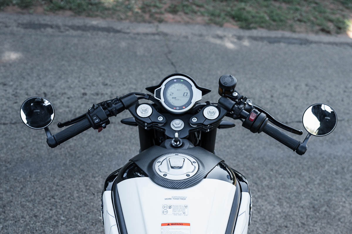 While some of our mates might disagree, we really enjoy this bikes styling and the – shall we say – flash colour scheme. It works. The little carbon fibre touches just add to the overall Retro appeal. We enjoy the Cafe’ racer styling and overall layout, we love the look of the exhaust, the clubman bars and the bar-end mirrors.
