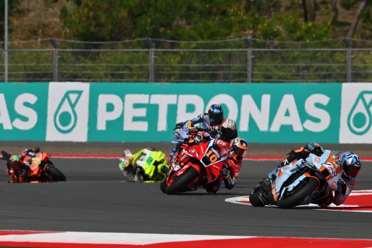 Marc Márquez booted Rins wide at Turn Ten on Lap One and got a Long Lap for his troubles. Chantra fell over immediately after, while Bastianini continued his crash streak at Turn Sixteen.