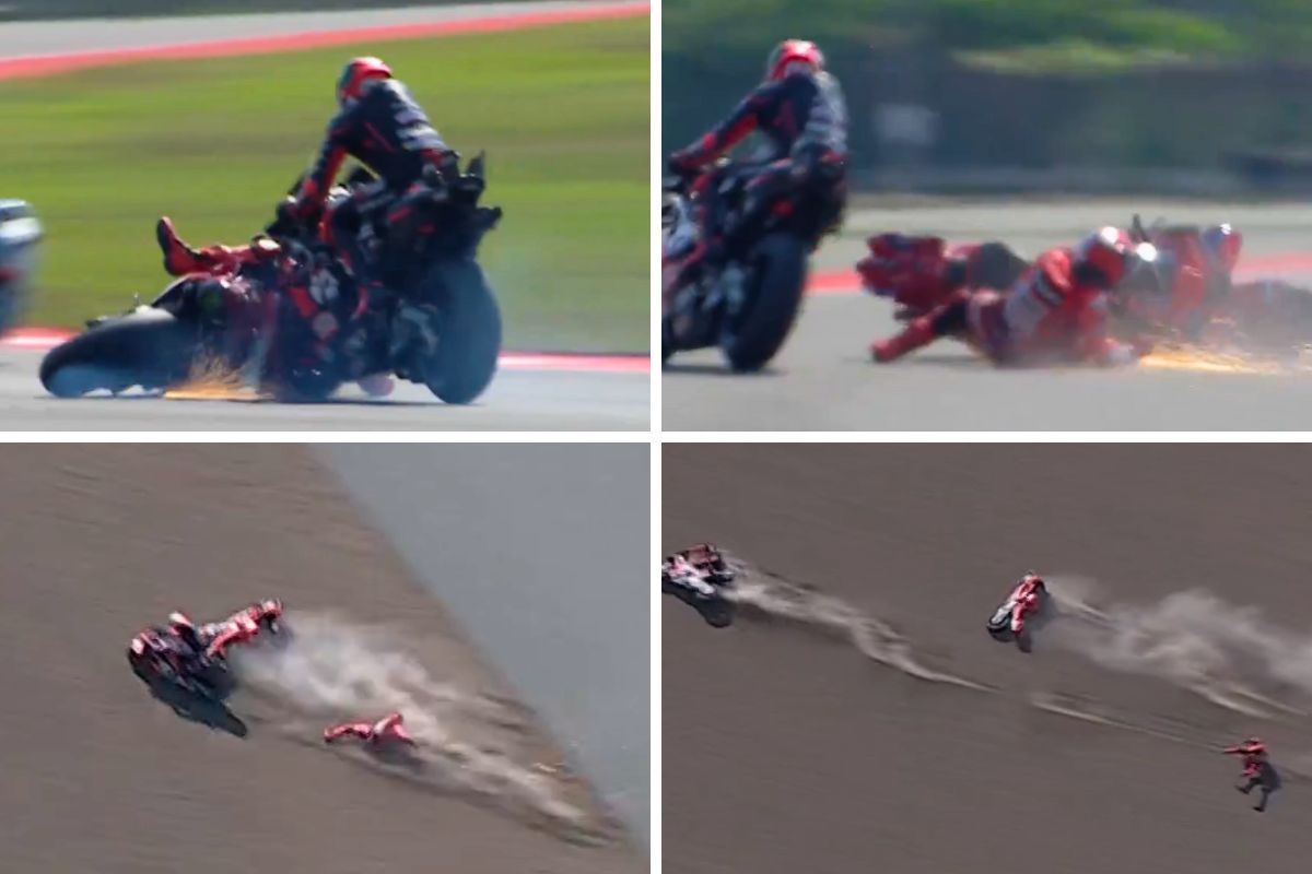 On Lap One, Bezzecchi arrived at Turn Seven like a missile and ploughed straight into Marc Márquez’s Ducati. Sparks, gravel, and drama everywhere. Marc briefly turned gravel skier before hitting a wall that was, unfortunately, not made of water. Both walked away, eventually, but Marc’s shoulder came out looking like confetti.
