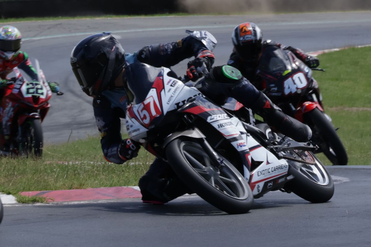 Heat 1 The new class debuted with four bikes on the grid. #57 Diego de Ponte took control after a side-by-side launch with #27 Triston Potgieter and rode to victory. Potgieter finished second and #33 Aston Nesbitt third.