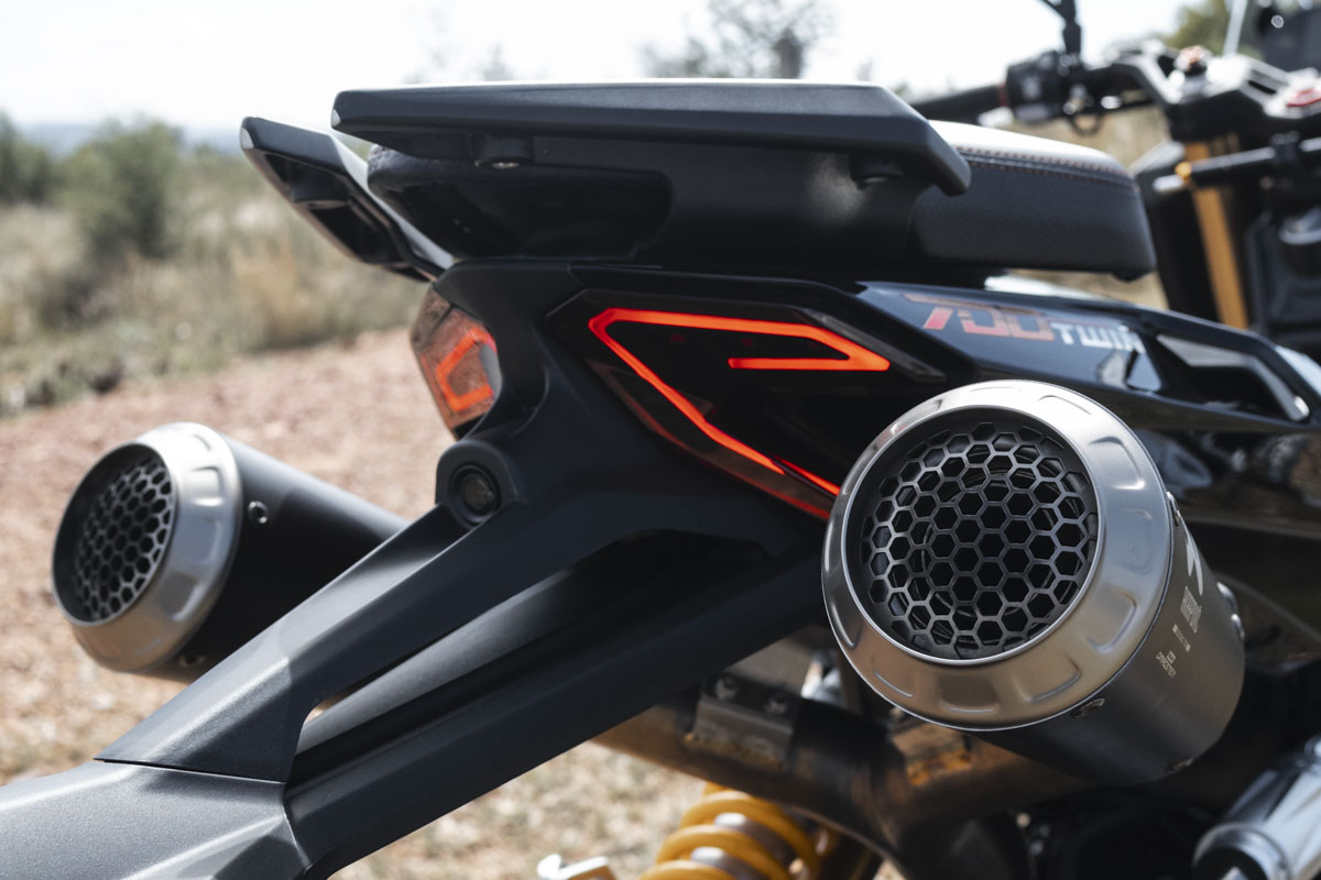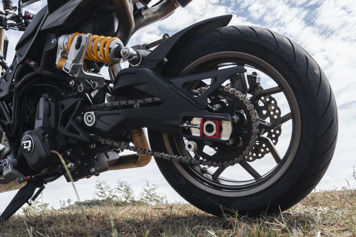 Pirelli Rosso Corsa tyres are mounted on small 15” wheels also define this as a scooter, but it produces roughly 68 HP with around 70NM of torque. Actually, probably more with that pipe that’s now been vented…