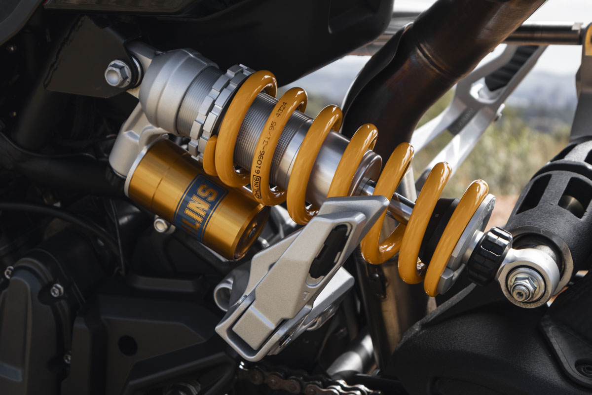 Ohlins Steering damper, Marzocchi front suspension, an Ohlins unit out back and high end Brembo brakes – complete with cooling fins.